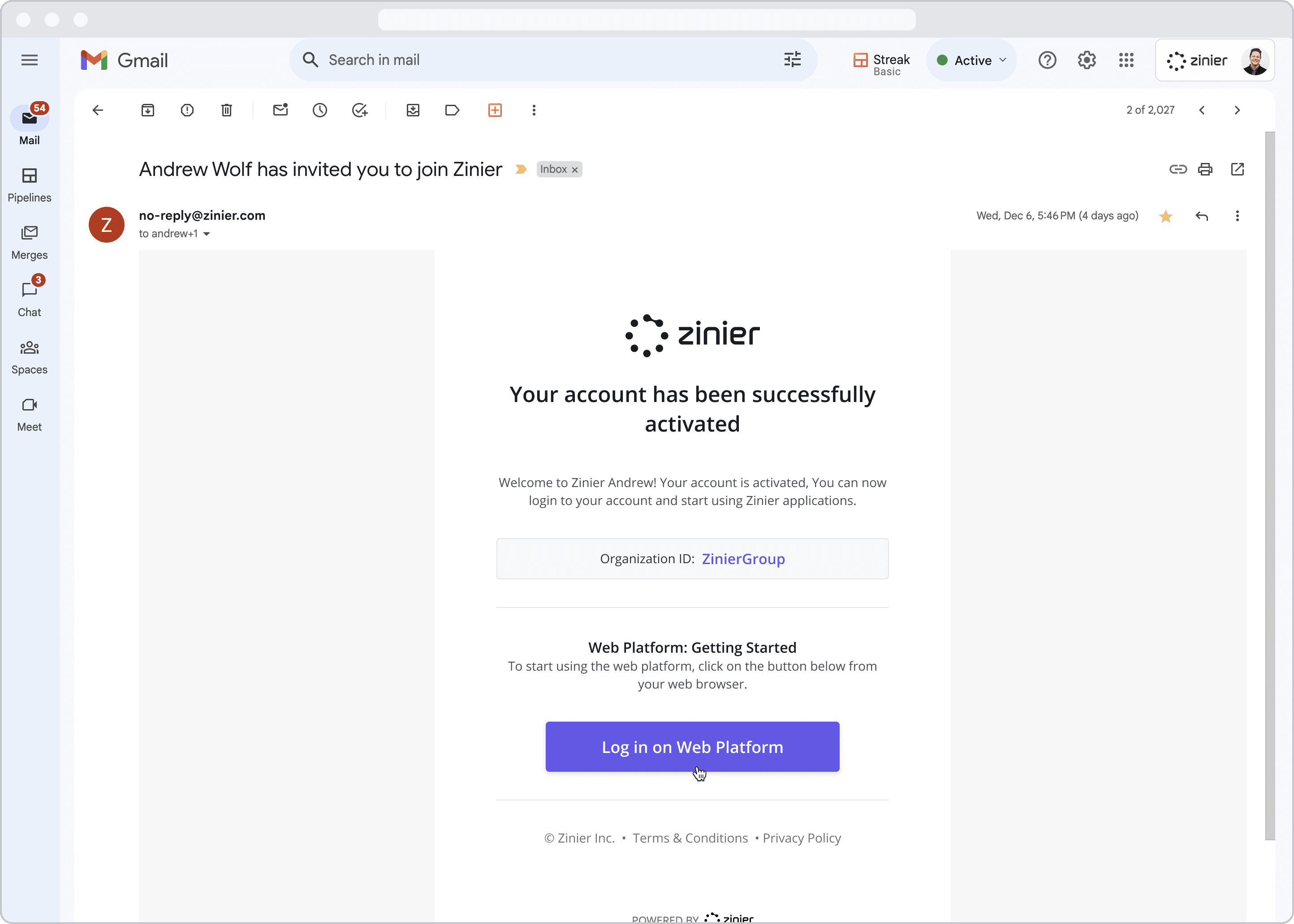 Open the email invitation with the subject line “[Name of the person who invited you] has invited you to join Zinier”.