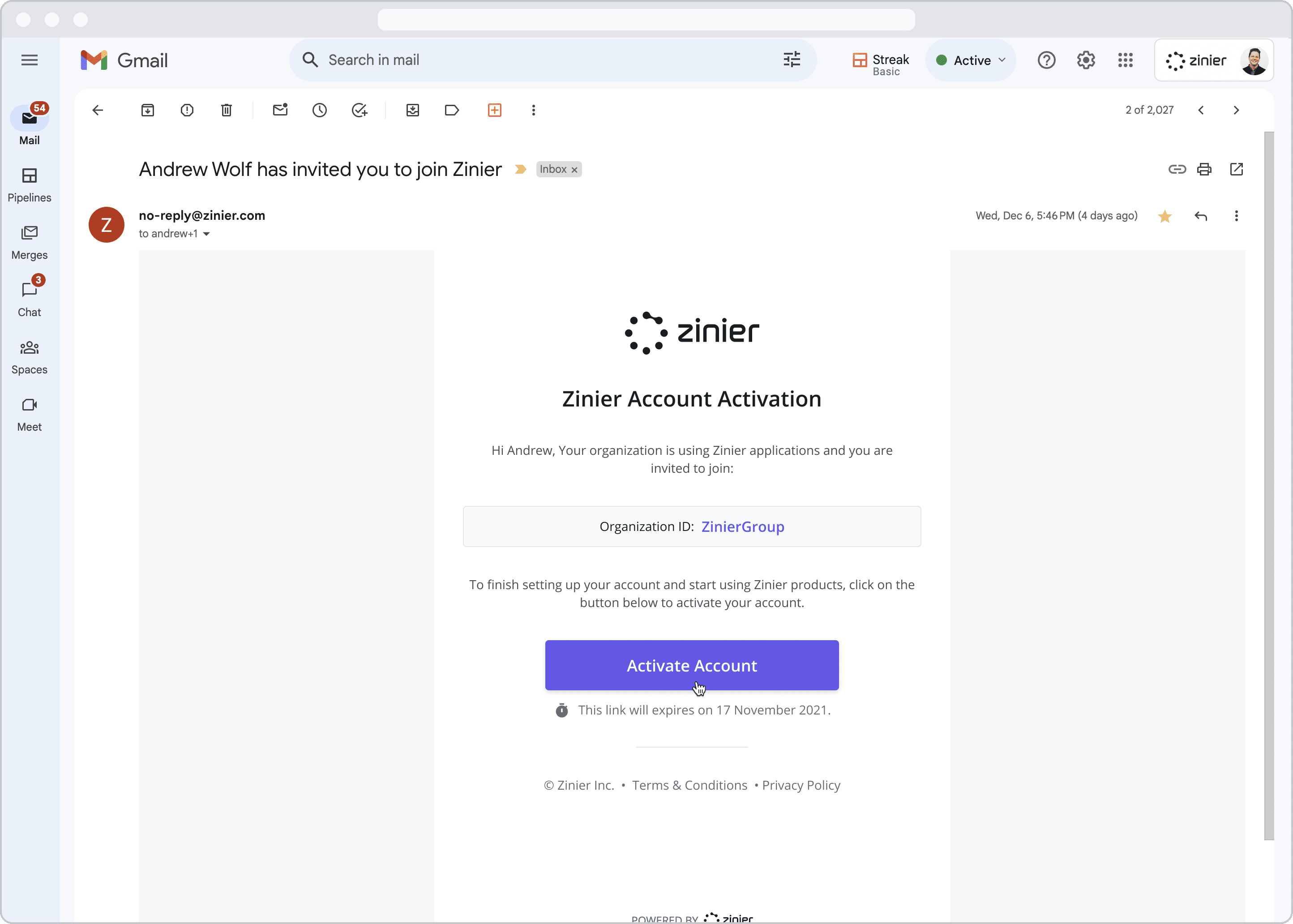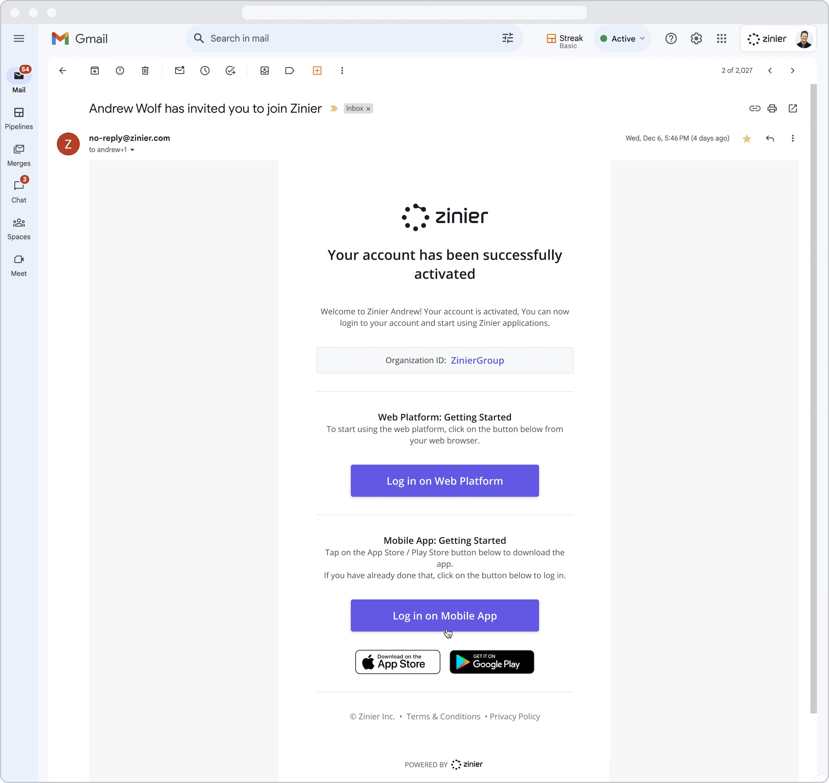 Organization ID: In the email body, you will notice a word in bold below the text “[Name of the person who invited you] invited you to join:” This is the Organization ID that you have been invited to. Please make a note of this. In the example below, the Organization ID is “ZinierGroup”.